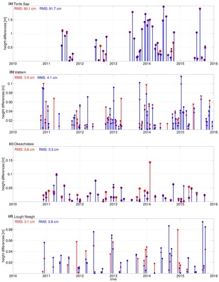 Height differences for the lakes (a) Tonle Sap; (b) Vättern; (c) Okeechobee; and (d) Lough Neagh between DGFI-TUM CryoSat-2 SAR altimeter water levels and the gauging data: considering the waveform class ”land-water transition“ (red) and neglecting the waveform class ”land-water transition“ (blue).