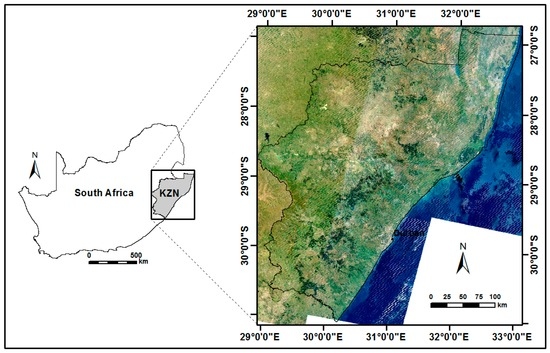 The KwaZulu-Natal province (KZN) (92,100 km2) of South Africa (Figure 1) has diverse land cover types and land uses ranging from natural grasslands and savannas to exotic forestry plantations, sugarcane, irrigated cultivation, dryland cultivation, low density, rural settlements and urban areas. The natural vegetation ranges along a continuum of tree cover, from grasslands, to open savannah woodlands, bushland, thickets, and indigenous forests (Appendix A) [49]. KZN is the only province in South Africa for which comparable multi-year land cover data are available, thus providing a suitably large area and heterogeneous study site [50].