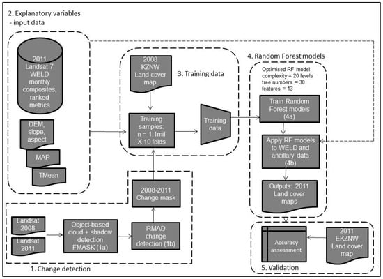 This paper presents and evaluates a Landsat Automated Land Cover Update Mapping (LALCUM) system designed for rapid regional to national scale land cover updates across large, heterogeneous areas, using 30 m Landsat time series. It responds to a specific need in South Africa to rapidly update a land cover map to a desired nominal year given a pre-existing reference land cover map. The US Geological Survey (USGS) first proposed such an update approach and used a spectral change detection approach to identify non-change areas which were used as samples to train a decision tree classifier [11] and this approach was further explored by Chen et al. [46]. Following this approach, we developed a methodology that uses the Iteratively Reweighted Multivariate Alteration Detection (IRMAD) [47,48] to identify areas in an existing reference land cover map where no change have taken place relative to a specific desired year of satellite data. These no-change areas were used to automatically generate large amounts of training samples as input to a non-parametric Random Forest classifier to map land cover using a Landsat ETM+ data for the desired year. The system was tested for the KwaZulu-Natal Province of South Africa for 2011 using a reference land cover map from 2008 after applying a change detection mask for 2008 to 2011. The novelty of the LALCUM system lies in its very high level of automation, which allows land cover maps to rapidly updated and the system’s high scalability to classify large diverse areas.