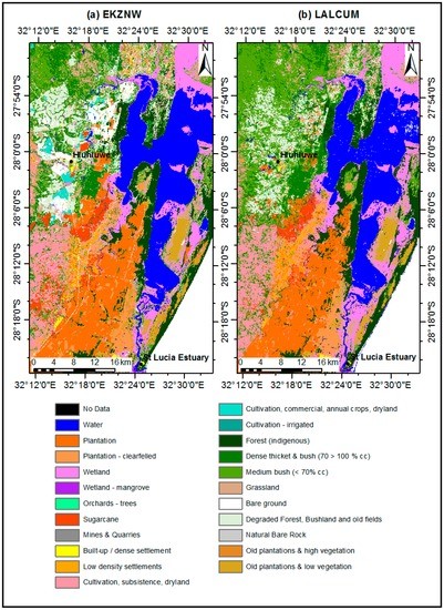 EKZNW land cover map for area surrounding Lake St. Lucia, iSimangaliso Wetland Park—World Heritage site, 2011 (a) and the land cover produced by the LALCUM system (b).