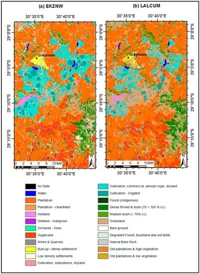EKZNW land cover map for area surrounding Greytown, 2011 (a) and land cover produced by the LALCUM system (b).