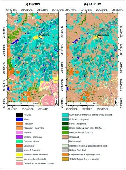 EKZNW land cover map for area surrounding Winterton, 2011 (a) and land cover produced by the LALCUM system (b).