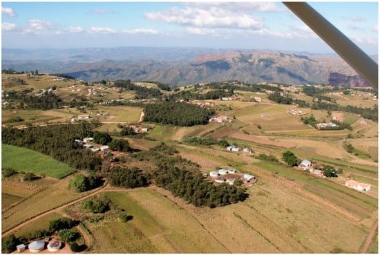 Oblique photograph taken during airborne validation illustrating the complex mosaic of low density, small dwellings within the “Low density settlements” land cover class, interspersed by small fields of active and fallow “Cultivation subsistence drylands”, as well as “Plantations”. (Photo credit: John Craige, Ezemvelo KZN Wildlife).