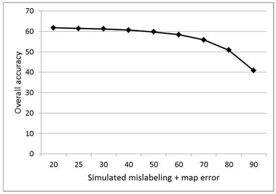 Overall accuracy of Random Forest classification after simulating additional mislabeled training samples in addition to the 20% error contained in the original EKZNW land cover maps on which it was trained.