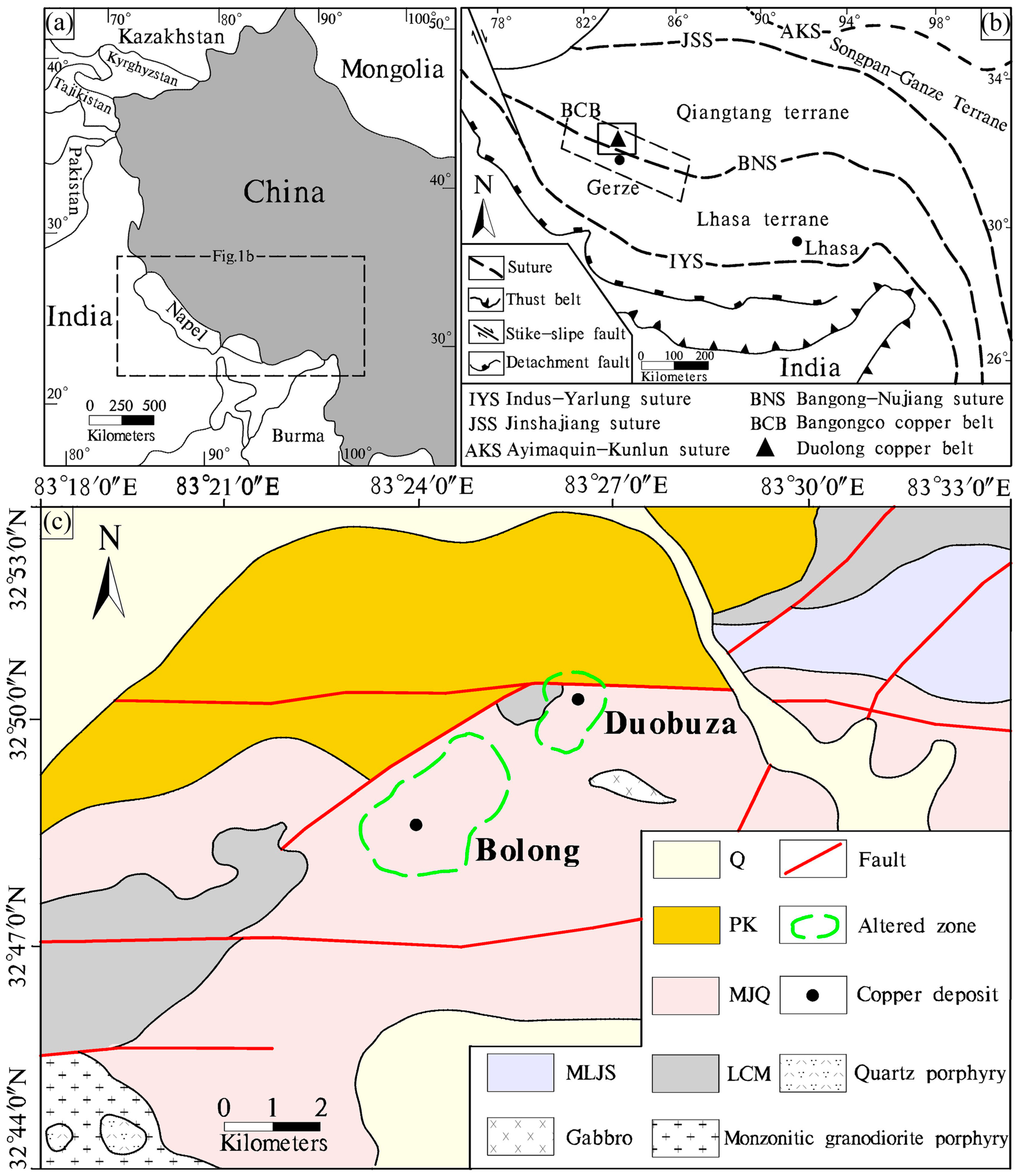 - Xu, W.; Li, C.; Wang, M.; Fan, J.J.; Wu, H.; Li, X. Subduction of a spreading ridge within the Bangong Co-Nujiang Tethys Ocean: Evidence from Early Cretaceous mafic dykes in the Duolong porphyry Cu-Au deposit, western Tibet. Gondwana Res. 2016, in press. [Google Scholar] [CrossRef]