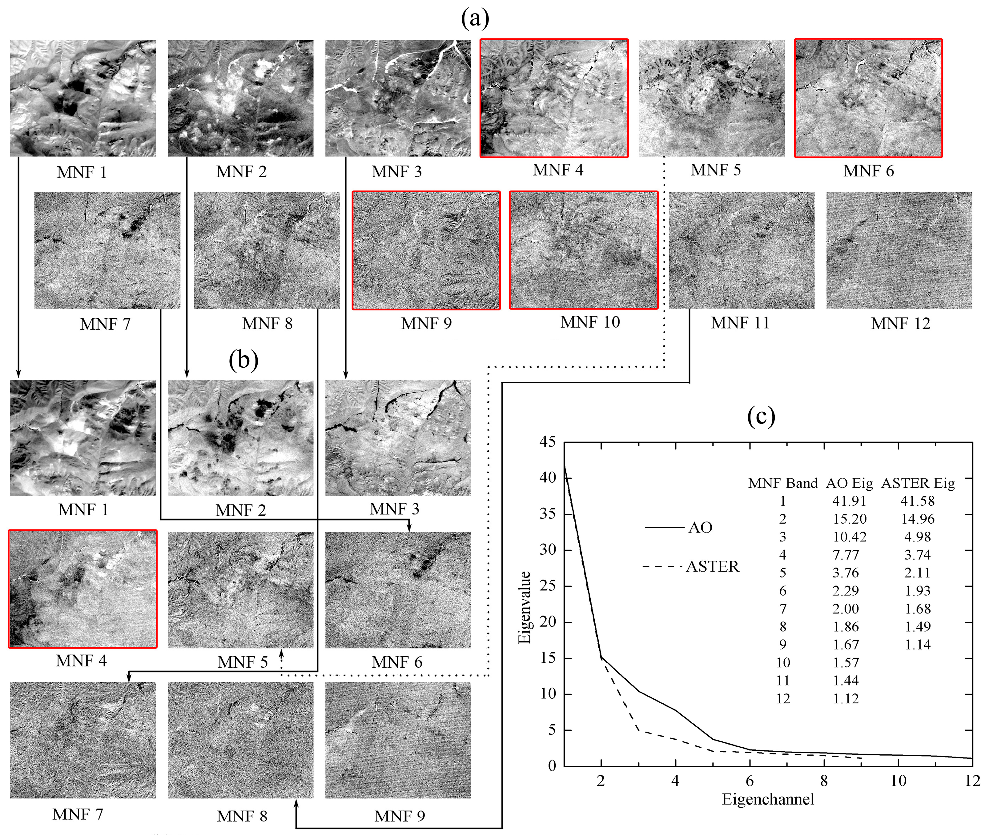 - The analysis of ASTER and AO data using Minimum Noise Fraction (MNF) transform reveals that a combination of ASTER and L8-OLI data (AO) has more mineral information content than either alone. The results of FI1 (B7/B1) and FI2 derived from AO data illustrate good compensatory capabilities, with OLI being well suited for discerning ferric iron minerals and ASTER enabling distinctions between other clay and sulfate mineral species.