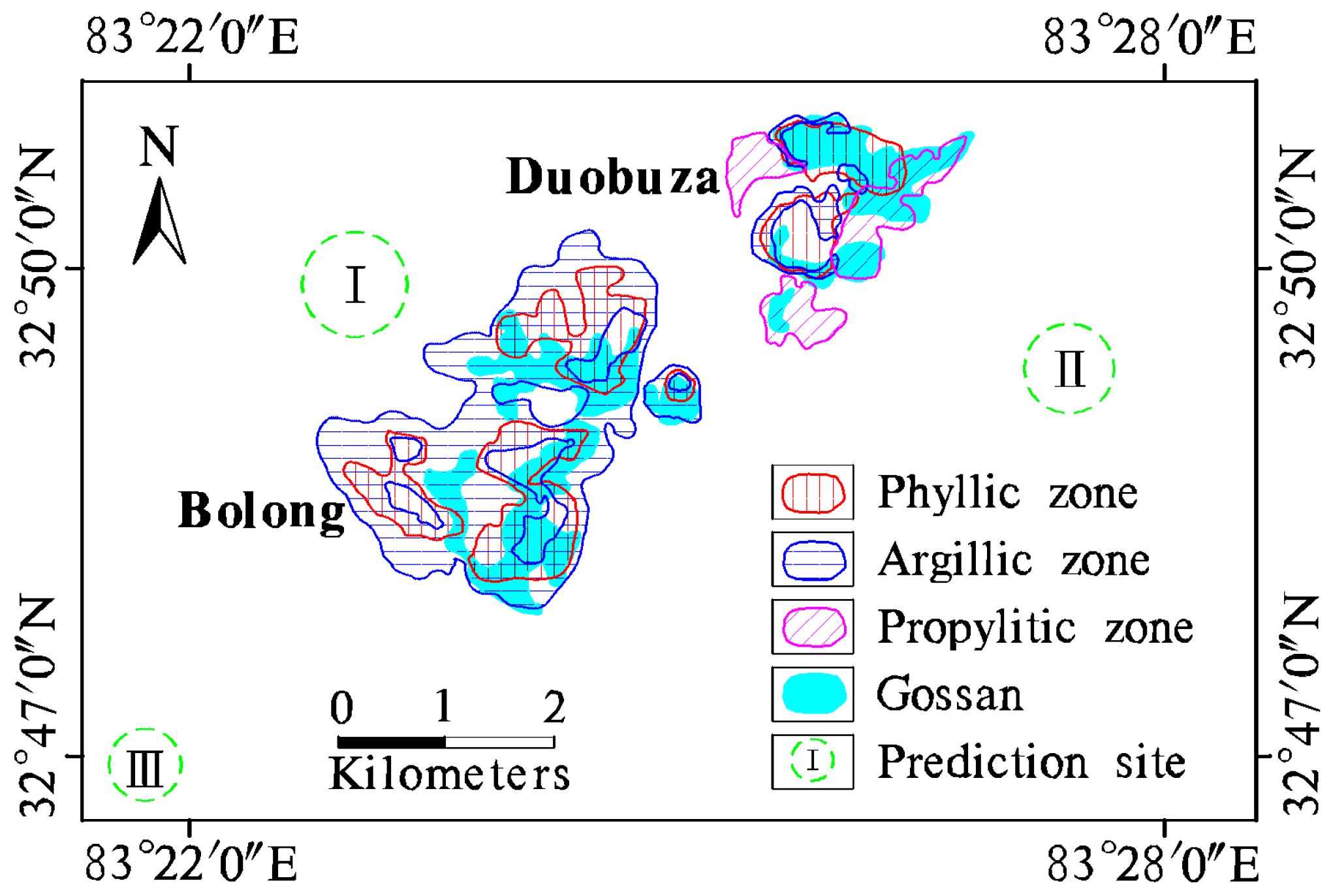 - The remote sensing study outlines a full picture of the surface-exposed alteration zones. There are three alteration group minerals from the interior to the exterior of Duobuza PCD: Al-OH2 (muscovite, kaolinite, illite, smectite), Al-OH3 (kaolinite, dickite), and Mg-OH2 (chlorite, epidote), which indicate the phyllic, argillic and propylitic alteration zones. Moreover, there are also two alteration group minerals from the interior to the exterior in the Bolong PCD—Al-OH2 (muscovite, kaolinite, illite, smectite) and Al-OH3 (kaolinite, dickite)—which indicate the presence of phyllic and argillic zones. In addition, gossans are also well mapped using the AO VNIR data. The distribution patterns of these alteration zones show a good correlation with the alteration zones derived by field investigations.