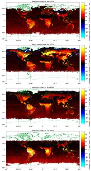 Early work on satellite remote sensing of vegetation fluorescence investigated the possibility of using the filling-in of strong Fraunhofer lines and specifically the filling-in of the dark and spectrally wide O2 A (~760 nm) and O2 B (~687 nm) line absorption bands (e.g., [28,41,42]). The proposed methods typically require accurate modelling of atmospheric radiative transfer in the absorption bands. A subsequent series of studies showed that filling-in of deep solar Fraunhofer lines can also be used to detect vegetation fluorescence from space [32,33,35,37,43], which in some respects simplifies the retrieval problem. The first maps of global terrestrial fluorescence using filling-in of Fraunhofer lines were achieved with the high-spectral-resolution interferometer aboard GOSAT [32,34,35]. GOSAT’s coarse temporal and spatial resolution, however, requires considerable averaging of the individual fluorescence retrievals into spatiotemporal composites to produce global maps, which may introduce sampling or representativeness errors.