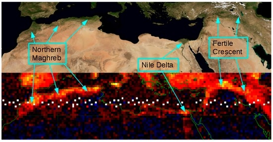 Apart from these large-scale biome patterns, very detailed spatially and temporally heterogeneous SiF patterns can also be observed from GOME-2A when evaluating over specific regions. Especially in arid regions with narrow strips of agricultural land such as in North Africa and the Fertile Crescent (Figure 3) the possibility of satellite monitoring of vegetation activity is demonstrated. The agricultural land use type shows substantially higher SiF values compared to its arid background with the highest values in March, April and May. From Fall on, retrieved values over the Fertile Crescent fade to background levels of the desert. Note that the surface albedo of desert areas is comparable to the surface albedo of vegetated land.