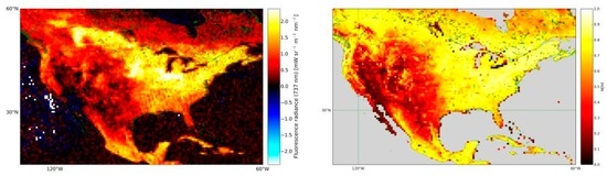 This short time series analysis illustrates the strong potential of SiF data to monitor vegetation activity in relation with meteorological anomalies [81,82]. Future research should further investigate the (complex) relation between satellite-retrieved solar-induced fluorescence and derived parameters, such as the fluorescence yield, and photosynthetic activity.