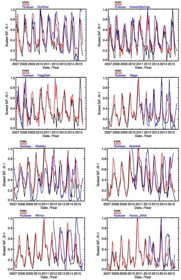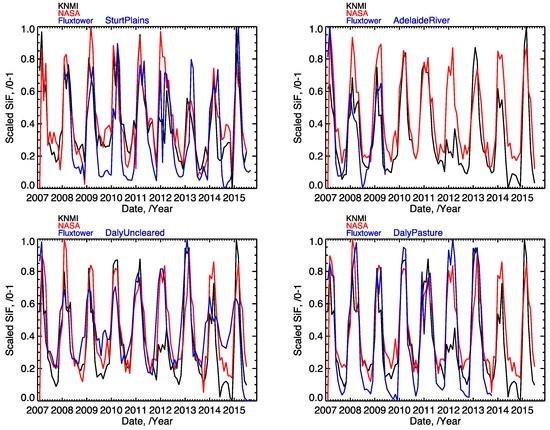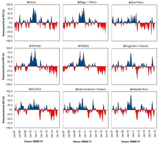 Across all the Australian flux tower sites in this study, a strong positive anomaly in the de-seasonalized SiF time series (computed by subtracting from each monthly value the eight-year average for that specific month and dividing by that value to obtain percentages) was observed in 2010/2011 (blue area in Figure 7). In contrast, strong negative anomalies were observed at the start and especially at the end of the de-seasonalized time series (red areas in Figure 7). This resulted in an increase (+2.7% to +17.2% year−1; on average 10.3% year−1) of de-seasonalized SiF from January 2007 to April 2011. This increase is higher over southern sites (Riggs, Wallaby, Whroo, Wombat, Yanco Jaxa: +15.7% to +17.2% year−1) compared to the northern ones (Sturt Plains, Daly Uncleared, Adelaide River, Daly Pasture, Dry River, Fogg Dam, Howard Springs: +2.7% to +7.5% year−1). For the period May 2011 to June 2015 a decrease is observed (+0.7% to −10.3% year−1; on average −6.0% year−1). This decrease is stronger over the southern sites (−5.9% to −10.3% year−1) as compared with the northern sites (+0.7% to −9.5% year−1). We attribute the increasing SiF values until 2010/2011 and the decreasing SiF values afterwards to the meteorological extremes occurring during that period: drought at the start of the time series indicated by the negative anomalies, the severe rainfall in 2010 and 2011 connected to La Niña indicated by the positive anomalies, and again the drier period at the end of the time series [77,78,79,80]. The small differences in responses (in magnitude, not sign) between northern and southern sites can perhaps be explained by the somewhat different impact of La Niña on precipitation and temperature in both parts of Australia [77].