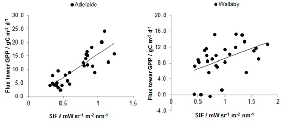 Sample scatterplots for the Adelaide ((left) high correlation between GPP and SiF); and Wallaby ((right) low correlation) sites.