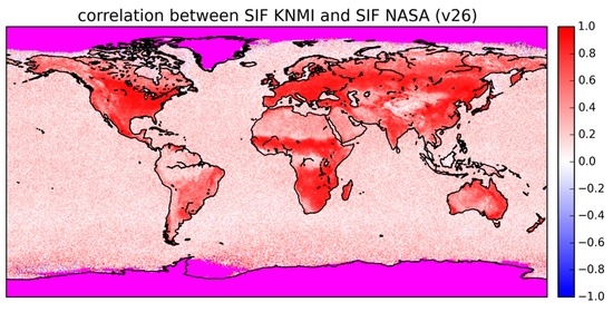 Only grid boxes that are over land and for which the monthly average in each time series is calculated from at least three successful SiF retrievals are taken into account. The correlation between the two datasets is 0.78 and the RMS difference is 0.35 mW/sr/m2/nm. Slightly different effective cloud fractions are used to filter the retrievals that go into the global SiF maps (0.4 in our implementation vs. 0.3 in SiF NASA, v26), but this has a negligible effect on the comparison. We find that filtering with cloud fractions other than 0.4 hardly changes the correlation. This is in agreement with Köhler et al. [36], who show that filtering with higher cloud fractions decreases SiF values but leaves temporal patterns mostly unaffected.