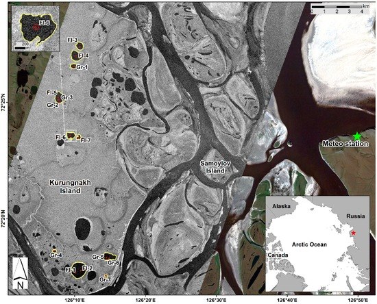 In this study, we focus on the southern part of the delta, particularly on Kurungnakh-Sise (or Kurungnakh) Island (Figure 1). The main part of the island consists of Pleistocene Ice Complex deposits (also known as Yedoma), which are underlain by fluvial sands and covered by a thin Holocene layer. The island has a maximum elevation of 55 m a.s.l. On its generally flat surface, deep thermokarst lakes and basins have made incisions as a result of permafrost degradation that started about 12 ka ago. About 7.5% and 38% of the island area is covered by thermokarst lakes and basins, respectively. Only 16% of the total basin area is occupied by remaining lakes, indicating past and current drainage processes [46].
