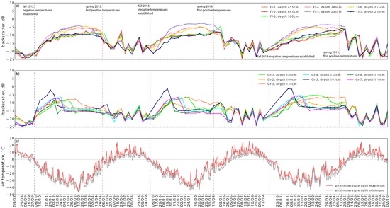 In the fall of 2014, air temperatures fell below 0 °C between 12 September and 26 October of the TSX acquisitions (there were no TSX acquisitions on 23 September as well as on 4 and 15 October) (Figure 2c). The three missing images did not allow us to detect the initiation of freeze-up. However, the mean backscatter intensity for all locations (except of the shallowest location Gr-5) increased during this period from −20 ± 0.6 dB to −15.9 ± 1.6 dB. The mean backscatter values over the period from 31 December 2014 to 1 May 2015 for the floating ice locations ranged from −11.7 to −4.3 dB (standard deviations between 0.6 dB and 1.8 dB).