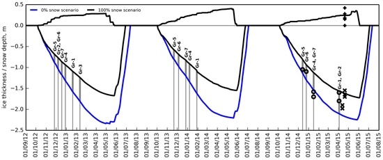 In winters 2012–2013 and 2013–2014, most of the locations showed substantial differences between simulated ice thicknesses and those measured in situ in April 2015, with in situ ice thicknesses typically larger (up to 0.5 m) than that simulated for the two winters, even with a 0% snow cover scenario.