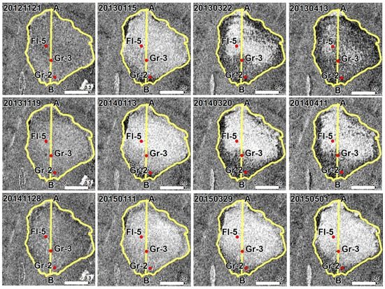 Selected stages of lake ice evolution for ice seasons 2012–2013 (upper row), 2013–2014 (middle row) and 2014–2015 (lower row). Profile A–B is used to represent the spatio-temporal development of backscatter intensity (Figure 5). Date format is yyyymmdd.