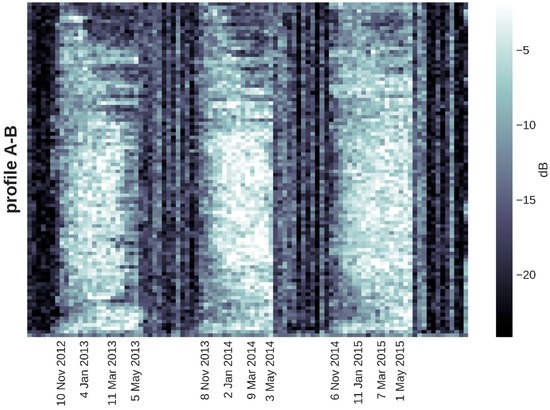 In order to demonstrate the spatio-temporal pattern without excluding any of 95 TSX images, we selected a profile across the same lake and produced a time series of backscatter intensity along this profile (Figure 5). The time series shows the progression of ice grounding as darker pixels appear along profile A–B. The ice grounding propagation from the south shore (B) towards the middle of the lake is evident during each of three years, as well as interannual variability reflected in a much smaller area of dark pixels in the last winter compared to the two previous years.