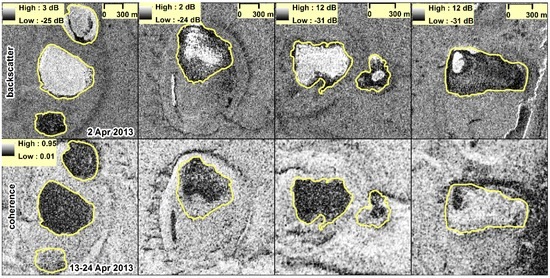 Figure 6 illustrates the difference between grounded and floating ice as revealed on both TSX backscatter intensity and coherence images. Grounded ice appeared dark (low backscatter) in a late winter backscatter image (upper row) due to low return caused by absorption of the SAR signal in the lake bottom sediments. Grounded ice appeared bright (high coherence) in a late winter coherence image (lower row) due to the absence of a change in the backscattering interface between two images, comprising a coherence pair.