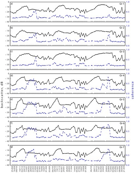 In general, pronounced coherence peaks appeared for the grounded ice locations and the seasons which also featured well pronounced backscatter drops (except for the season 2013–2014 when coherence increase did not occur in most cases). There were some exceptions: location Gr-2 did not demonstrate a well pronounced backscatter drop in the 2014–2015 season, but coherence featured a clear increase for this season (Figure 7b). For most cases, the first increase in coherence occurred later than the first drop of backscatter. The maximum coherence values were observed before spring melt, which was characterized by an abrupt drop in coherence down to values of ~0.2 for all the grounded ice locations.