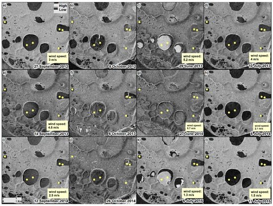 Sub-areas of TSX intensity maps showing events in the ice phenology cycle for three ice seasons: (a–d) 2012–2013; (e–h) 2013–2014; (i–l) 2014–2015. Yellow dots are drilling locations. Wind speed measurements are from automatic weather station on Kurungnakh Island at 08:30 local time of TSX acquisition day (TSX acquisition is at 08:34 local time).