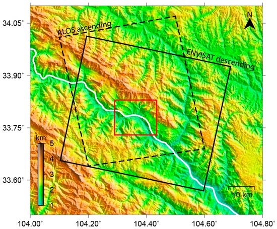 Shaded-relief map of Zhouqu. The red box reveals the scope of the study area. Black real and dashed boxes indicate the coverages of the Advanced Land Observing Satellite (ALOS) ascending and Environmental Satellite (ENVISAT) descending datasets, respectively. The white line represents the Pai-lung River.