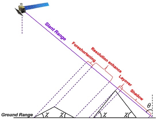 It is acknowledged that the geometric distortions cannot be avoided in the SAR images acquired over mountainous areas due to the side-looking geometries of the current SAR sensors [10]. Figure 2 illuminates how the geometric distortions work in the SAR images. For the slopes dipping towards the SAR sensor, when the local terrain slope angle is smaller than the local incidence angle , such slopes have a shorter length in the SAR image than on the flat terrain, which means the range resolution on such slopes becomes worse. This is the so-called foreshortening effect, which achieves worst performance when equals to . Furthermore, when is larger than , the bottom and the top of such slopes are reversedly imaged, known as the layover effect. Generally, the layover-occurring slopes are much brighter than other places on the SAR image. For the slopes dipping away from the SAR sensor, when is smaller than , the range resolution on such slopes becomes better in the SAR images than on flat terrain. Obviously, the resolution-enhancing effect is popular with InSAR measurements. However, when exceeds , such steep slopes are completely prevented from receiving the SAR signal by the mountain itself. This is the shadow effect that makes the slopes dark in the SAR image. For more details on geometric distortion analysis, see [10].