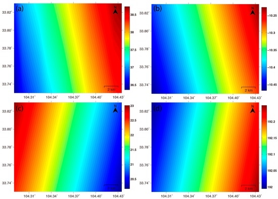 In this study, the ALOS ascending images and ENVISAT descending images collected over the Zhouqu area are investigated for their geometric distortions. The local incidence angle and the azimuth angle for the used ALOS ascending data are shown in Figure 3a,b, respectively. is also the flight angle of SAR satellite, which is clockwise from the north. It is observed that of the used ALOS ascending data ranges from 36.4° (near range) to 38.7° (far range), while of the used ALOS ascending data is approximately −10.3° (at mid-range). Figure 3c,d show and for the used ENVISAT descending data, respectively. of the used ENVISAT descending data, varying from 20.2° (near range) to 23.0° (far range), is smaller than that of ALOS ascending data. of the ENVISAT descending data is around 192.1° (at mid-range). All of the angles behave as gradually varying ramps.
