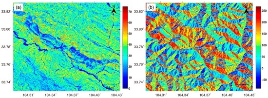 The local terrain slope angle and the local terrain aspect angle for the study area are estimated from the 1 arcsec Advanced Spaceborne Thermal Emission and Reflection Radiometer Global Digital Elevation Model (ASTER GDEM) data. As shown in Figure 4a, the Zhouqu area is characterized by mountainous terrain, with an average of 31.5°. Although reaches 74.6° for the largest slope angle, the terrain is relatively flat near the Pai-lung River. With respect to the local terrain aspect angle , which is also clockwise from the north, it is found in Figure 4b that the slopes in the Zhouqu area have quite complicated orientations, ranging from −88.2° to 267.7°.