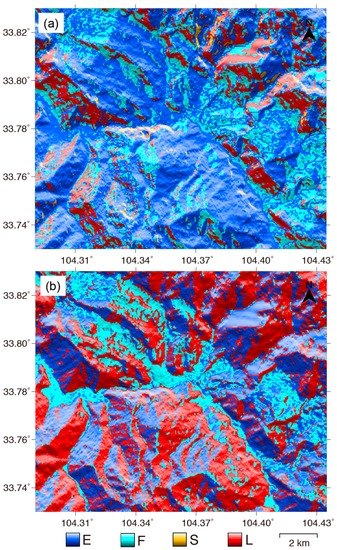 Geometric distortions in the ALOS ascending (a) and ENVISAT descending (b) images acquired over Zhouqu. E: Resolution-Enhancing; F: Foreshortening; S: Shadow; L: Layover.