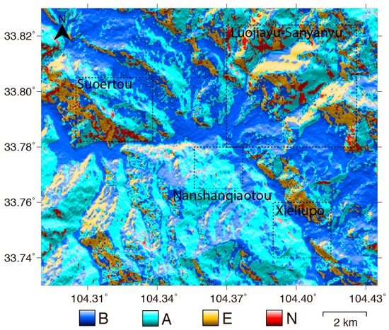 Integrating result of the geometric distortions of the ALOS ascending and ENVISAT descending data. B: appropriate for both data; A: appropriate for ALOS data; E: appropriate for ENVISAT data; N: appropriate for neither data.