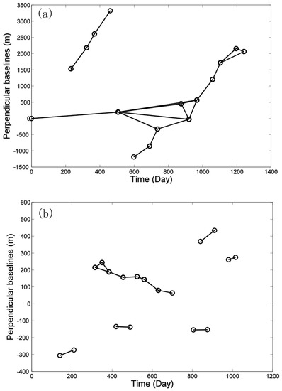 Spatial-temporal baselines of the generated ALOS ascending (a) and ENVISAT descending (b) interferograms. Circles and lines represent SAR images and interferometric pairs, respectively.