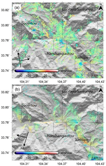Figure 8a,b show the TCP-InSAR derived LOS deformation rate fields from ALOS ascending and ENVISAT descending datasets, respectively. Obviously, the coverage of the ALOS deformation field is much larger than that of the ENVISAT deformation field. This is expected since the areas affected by severe geometric distortions in the ENVISAT data are much more than those in the ALOS data. In addition, C-band ENVISAT data is more vulnerable to the vegetation due to its relatively weaker penetration.