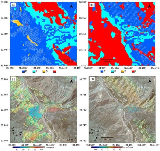 (a,b) locations of temporarily coherent points (TCPs) in Xieliupo region derived from ALOS ascending and ENVISAT descending results, respectively, which are superimposed on the corresponding geometric distortions. E: Resolution-Enhancing; F: Foreshortening; S: Shadow; L: Layover; (c,d) LOS deformation rates at the Xieliupo region estimated from ALOS ascending and ENVISAT descending datasets, respectively, which are superimposed on the optical image. AZ and LOS indicate the azimuth and the LOS directions, respectively.