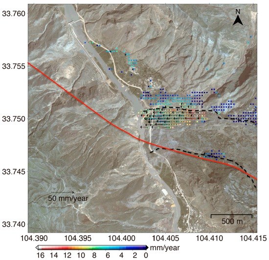 3D deformation rates of the Xieliupo landslide, where the color and the arrow represent the vertical and horizontal deformation velocities, respectively. Black dashed line outlines the scope of the Xieliupo landslide [38]. Red line marks the location of Pingding-Huama fault [38].