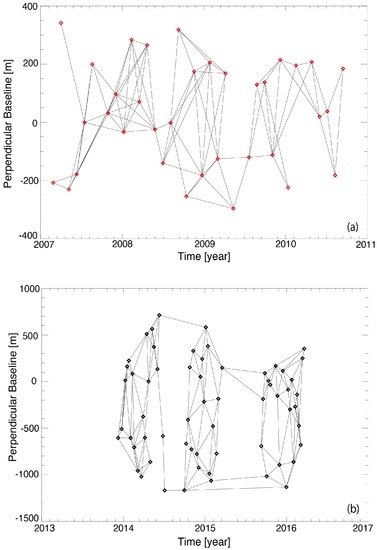 Distribution of the available ASAR/ENVISAT (a); and COSMO-SkyMed CSK (b) Synthetic Aperture Radar SAR data in the temporal/perpendicular baseline domain; SAR data are represented by red (a); and black (b) diamonds, whereas connecting arcs are representative of the selected, small baseline interferometric data pairs.