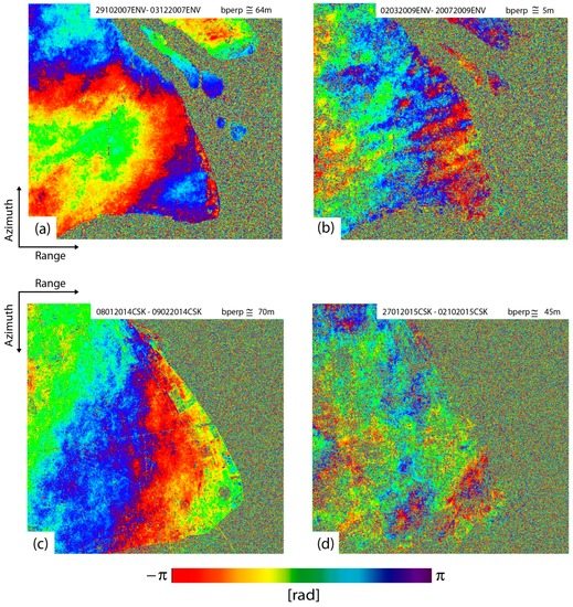 Four selected DInSAR interferograms relevant to the Shanghai area, achieved by exploiting ENVISAT/ASAR acquisitions over ascending orbits (a,b); and CSK SAR data over descending orbits (c,d): (a) 29 October 2007–3 December 2007, ENVISAT interferogram, with a perpendicular baseline = 64 m, and temporal baseline = 35 days; (b) 2 March 2009–20 July 2009, ENVISAT interferogram, with a perpendicular baseline = 5 m, and a temporal baseline = 140 days; (c) 8 January 2014–9 February 2014, CSK interferogram, with a perpendicular baseline = 70 m, and a temporal baseline = 32 days; and (d) 27 January 2015–2 October 2015, CSK interferogram, with a perpendicular baseline = 45 m, and a temporal baseline = 248 days.