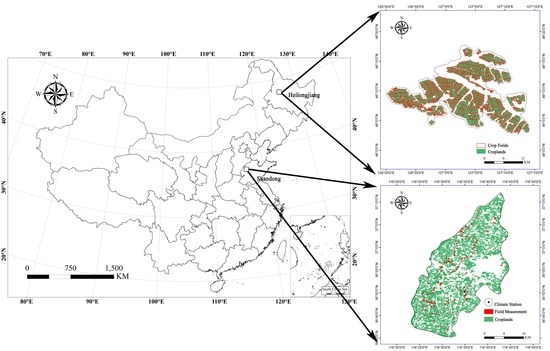 The Yucheng site in Shandong province and the Hongxing farm in Heilongjiang Province were selected as study areas. Green shading indicates croplands. The red boxes and solid squares indicate the places where ground measurement was carried out.