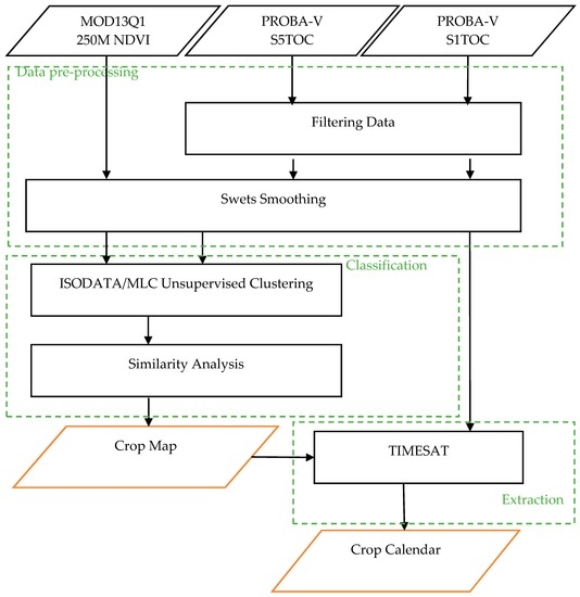 Three main steps were performed with MODIS and PROBA-V images at the Yucheng site and Hongxing farm: Data pre-processing; Classification and Extraction of the phenological parameters (Figure 3). In this study, the PROBA-V S5TOC 100 m NDVI and MOD13Q1 250 m NDVI data are used for crop mapping. The crop mapping result and PROBA-V S1TOC 300 m NDVI data are used to monitor crop phenology.