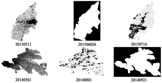 At the Yucheng site, we identified two crop classes using both PROBA-V or MODIS time series data (Figure 5a,b). Figure 2 shows the PROBA-V 100 m data coverage over 5 days. The brighter, white areas are an overlap location where a bowtie effect appears due to the different scanning strips at different times in the PROBA-V synthesis products [73]. This bowtie effect also appeared for MODIS products and almost all of the cross-track-scanning imaging radiometers [74,75,76]. Many quick and efficient algorithms have been developed to remove these effects on single data [67,77,78], but the impact of the bowtie effect on the time series classification still exists. Although the error can be easily removed by combining the two classes through visual interpretation, it still causes difficulty for automatic batch processing. The issue will be reduced by a satellite with a global coverage capacity at higher spatial and temporal resolution.
