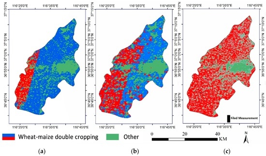 The crops are typically winter wheat followed by summer maize at the Yucheng site. To obtain the best classification result, five cluster types were selected by the ISODATA/MLC clustering of the NDVI time series data. Based on the crop type proportion in the study area, only one type of crop can be identified. We combined the clusters identified as having similar time series profiles, and designated two types by similarity analysis: Wheat-maize double cropping and other. A high resolution crop map retrieved through visual interpretation and supervised classification with the field measurement points based on a GF-1 16 m resolution image was used as the field survey for validation. Figure 5 displays the classification results which are, in order, the PROBA-V result, the MODIS result and the field survey, with the measured points attached. As shown in Figure 5a,b, the wheat-maize in the PROBA-V result and the MODIS result were divided into two areas on the map (Blue and Red color). Yucheng is in a scan-to-scan overlapping observation area of PROBA-V and MODIS satellites. The bowtie effect between two strips on the overlap led to an apparent stripping effect on the classification results [67].
