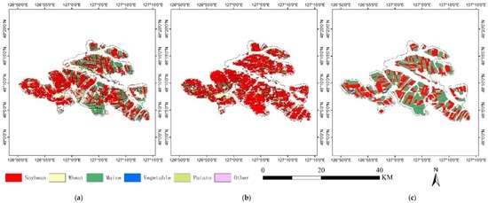 The Hongxing farm employs a much more complex cropping system. Soybean (281), wheat (26), maize (256), vegetables (3) and potatoes (5) are growing in 571 fields, and the growing seasons of different crops are all concentrated in the second half of the year, which makes crop classification difficult. To identify more crops, we tried out 5–10 clusters in the unsupervised cluster analysis, and 6 clusters were selected as the parameter for this process (Having more than 6 clusters did not yield more crop types). Due to the limitation of current image quality and technology, 8 vegetables and potato fields were still not identifiable. The crop map produced using the PROBA-V images and MODIS images are shown in Figure 6. Figure 6c shows the planting schedule in 2014. The PROBA-V results clearly indicated three crops, including soybean, wheat and maize. Due to the closed growing seasons and NDVI values for soybean and maize (Figure 7), we could not identify these two crops from the MODIS images, no matter how the parameters of the ISODATA/MLC clustering analysis were adjusted. The classification accuracies of the images from the two sensors are shown in Table 3.
