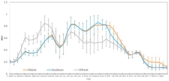 The normalized difference vegetation index (NDVI) has commonly been used to detect vegetation features [12] by taking advantage of the reflective and absorptive characteristics of vegetation in the red and near-infrared portions of the electromagnetic spectrum [13,14]. In general, NDVI with finer spatial resolution results in better vegetation classification [15,16,17]. However, due to the similarity in the spectra of different crops and the diversity in growing stages of one crop type, it is difficult to identify types by improving spatial resolution only. In addition, the existing crop classification methods based on high spatial resolution image often requires image acquisition from a certain stage during the growing season [18], which makes it difficult to automate crop identification in a complex cropping system.