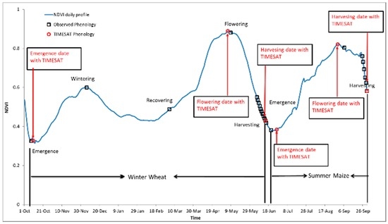 For wheat, the gaps between the observed phenology and the TIMESAT result for the emergence and flowering stages were less than 1 day. After harvest, the wheat straw was always left on the farm as fertilizer and was shown on the NDVI time series curve as a flat line after the maturity stage, which made it difficult to identify the actual harvest time. The gap between observed and TIMESAT results for harvest of wheat at the Hongxing farm is 44 days.