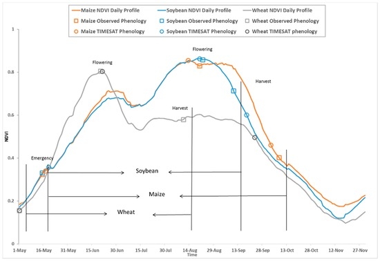Maize and soybean have similar phenological characteristics in that the emergency and flowering date are closed, however, the major difference is that maize has a longer growing season and is harvested later. The phenology monitoring result between observed and TIMESAT are shown in Figure 9. With the precise amplitude thresholds, the gaps between the observed phenology and the TIMESAT result for the three phenology stage were less than 10 days.