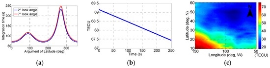(a) Integration time of L band geosynchronous synthetic aperture radar (GEO SAR) in different orbit positions (0.24 m wavelength, 20 m azimuth resolution, a “figure-8” inclined orbit (0.07 eccentricity, 42,164 km semi-major axis and 53° inclination)); (b) An example of the vertical TEC variation at the site (10°N, 150°W) within 250 s (UTC Time 23:06:00–23:10:10, 16 September 2013); (c) An example of the vertical TEC variation within a spatial scope (UTC Time 23:00, 16 September 2013). The data in (b,c) derive from the United States Total Electron Content (USTEC) data released by the National Oceanic and Atmospheric Administration (NOAA) [32], which is near real-time assessment of the TEC by GPS signals. The USTEC uncertain in the vertical TEC (VTEC) is about 2 TECU (TECU is the unit of TEC, 1 TECU = 1 × 1016 electrons/m2) during quiet geomagnetic conditions.