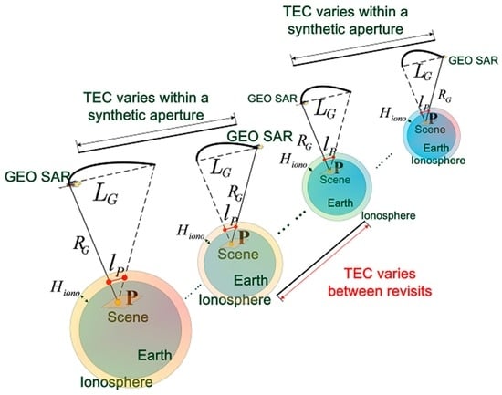 The sketch map of a GEO D-InSAR system in the presence of the background ionosphere is shown in Figure 2. Point is the target on the ground. is the slant range of GEO SAR. is the synthetic aperture of GEO SAR, and is the equivalent projections of the corresponding synthetic apertures on the ionosphere. is the representative height of the ionosphere. The color variation of the ionosphere represents the TEC variation. Because of the long integration time of GEO SAR, TEC is obviously changing, not only between the revisiting interval, but within the integration time.
