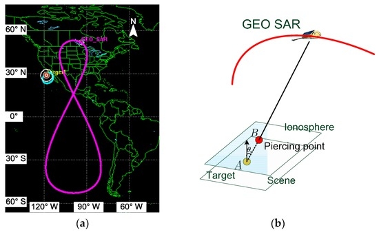 Shown in Figure 3a, the inclined GEO SAR orbit with a “figure-8” nadir-point trajectory is utilized. Its orbit parameters are given in Table 1. Our scene of interest in the simulation is an area of more than 1000 km × 1000 km, which has a center at Isla Guadalupe Island (29.02°N, 118.27°W) in the Pacific Ocean. As shown in the sketch map in Figure 3b, the GEO SAR signal obliquely traversed in the space to illuminate target A. Thus, the calculated IPPs of target A should be located at point B. Meanwhile, the VTEC should be transformed into STEC as well. Moreover, as discussed in Section 2, since the TEC variation caused by the spatial IPPs variation is negligible, we ignore the impacts of TEC variation caused by the spatial IPPs variation in the following data processing.