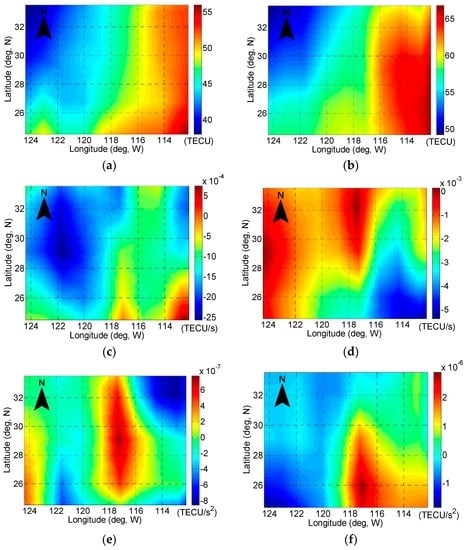 TEC data during two acquisitions of the InSAR pair. The first track: (a) TEC0; (b) k1; (c) k2; the second track: (d) TEC0; (e) k1; (f) k2.