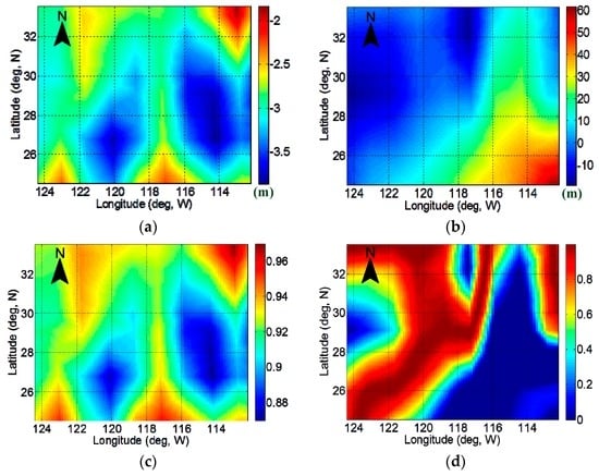 Based on the TEC data (as shown in Figure 4) and the GEO SAR configuration, the relative image shift and the decorrelation of the InSAR pair are obtained and shown in Figure 5. It can be concluded that the largest range relative shift is less than 4 m, which gives rise to a loss of correlation coefficient of no more than 0.13. As the difference of the constant components of the TECs during the InSAR pair acquisitions are only about 10 TECU, the corresponding range relative shift is limited. The obvious range relative shift will only be generated in the case of a large difference in the constant components of the TECs during the InSAR pair acquisitions. For instance, in a condition of a 50 TECU difference for the constant components of the TECs during the InSAR pair acquisitions, the generated range relative shift is larger than 13 m and a total decorrelation will occur. Nevertheless, it is generally uncharacteristic that there will be a large bias between the TEC data during the two acquisitions of the InSAR pair in natural conditions.